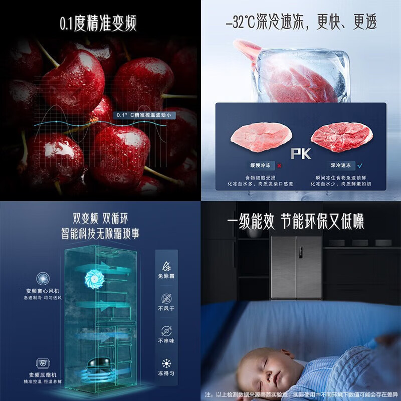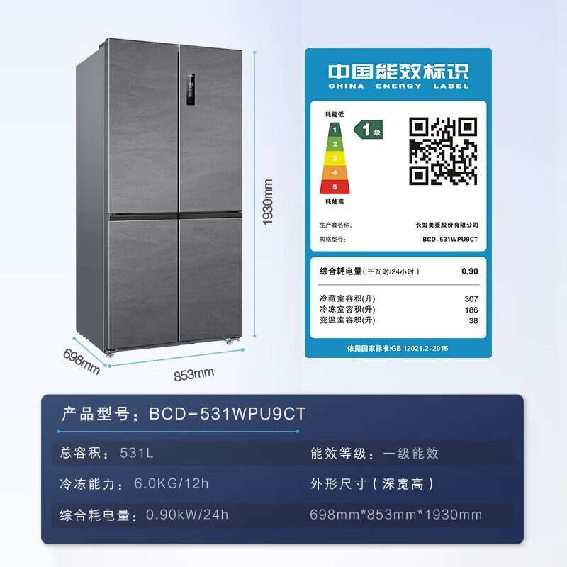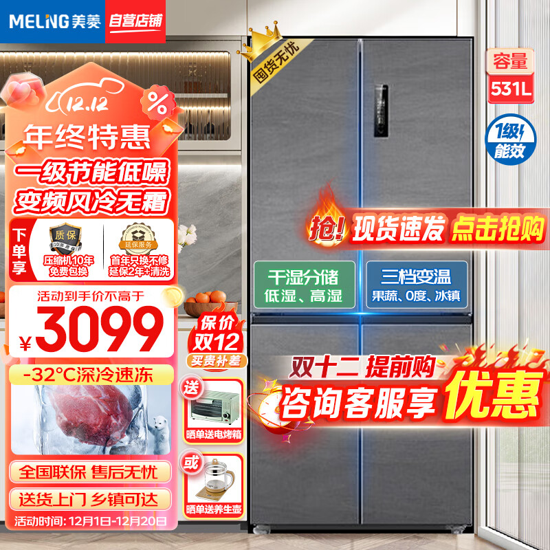 美菱(MeiLing)【十分净】531升十字门四开门多门家用大容量冰箱风冷无霜一级能效双变频速冻电冰箱BCD-531WPU9CT价格:3099.00元!