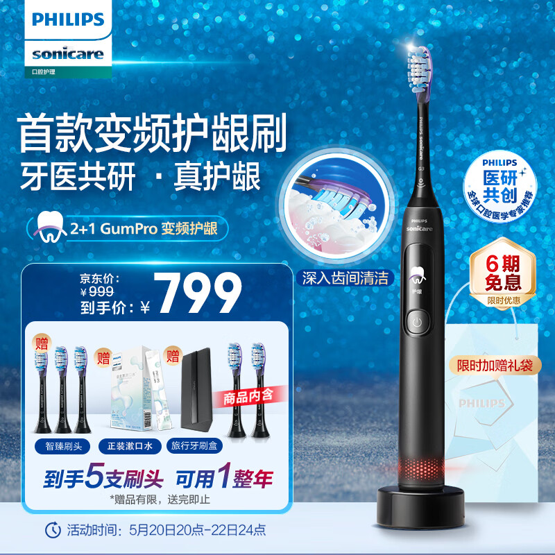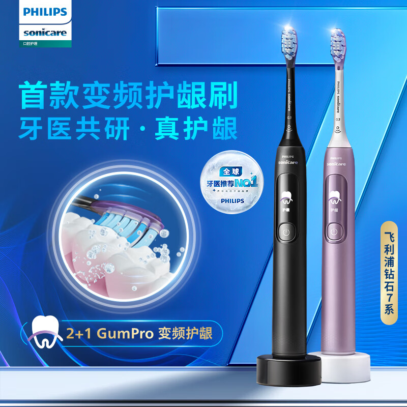 飞利浦(PHILIPS)电动牙刷 520情侣送男/女友 母亲节礼物 5种模式智能显示屏2支护龈刷头钻石7系极夜黑价格:999.00元!