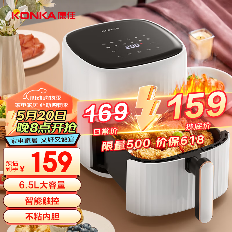 康佳(KONKA)智能空气炸锅 烤肉锅家用多功能低脂无油煎炸空烤电炸锅 不粘易清洁6.5L大容量 KKZG-6017E-W(B)价格:159.00元!