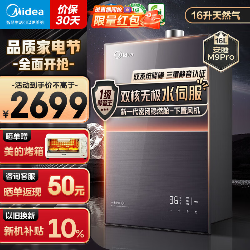 美的(Midea)16升燃气热水器 下置风机双核无极恒温增压水伺服一级静音安睡系列M9 Pro智能强排式热水器天然气 16L 安睡JSQ30-M9 Pro 天然气价格:3199.00元!