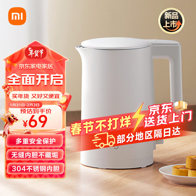 米家小米电水壶 N1热水壶304不锈钢双层防烫1500W速热暖水壶烧水壶智能断电价格:69.00元!