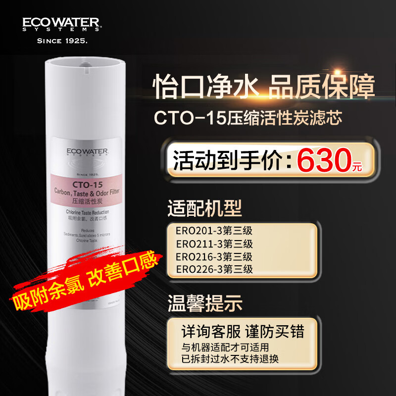 怡口净水(ECOWATER)CTO-15滤芯 家用压缩活性炭净水器耗材 除异色异味改善口感 适配机型详询客服价格:630.00元!