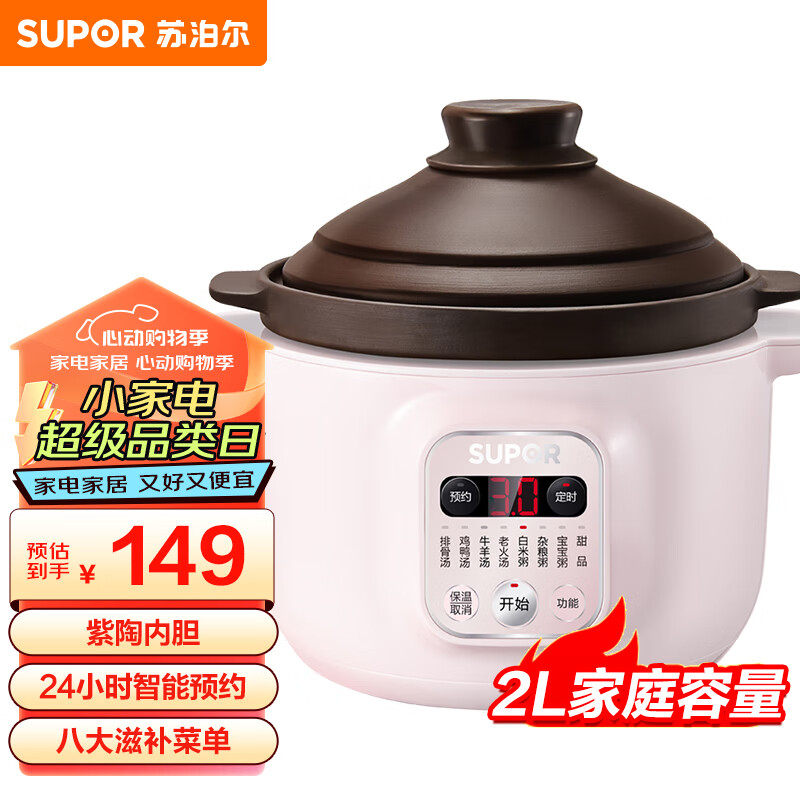 苏泊尔(SUPOR)电炖锅 电炖盅 电砂锅 煲汤锅炖汤锅 燕窝炖盅 煮粥锅 电煮锅 婴儿辅食锅 紫砂 2L DG20YC815价格:149.00元!