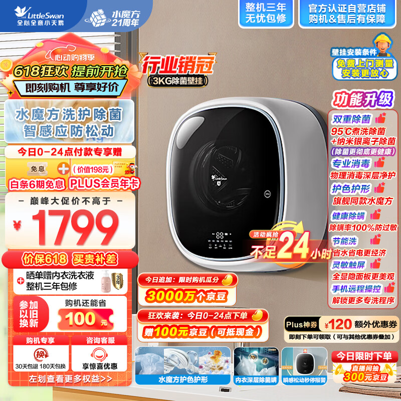 小天鹅(LittleSwan)3公斤壁挂洗衣机 小海绵 迷你洗衣机全自动 内衣裤洗衣机 婴儿挂壁式 水魔方 高温除菌 TG30V860E价格:1779.00元!