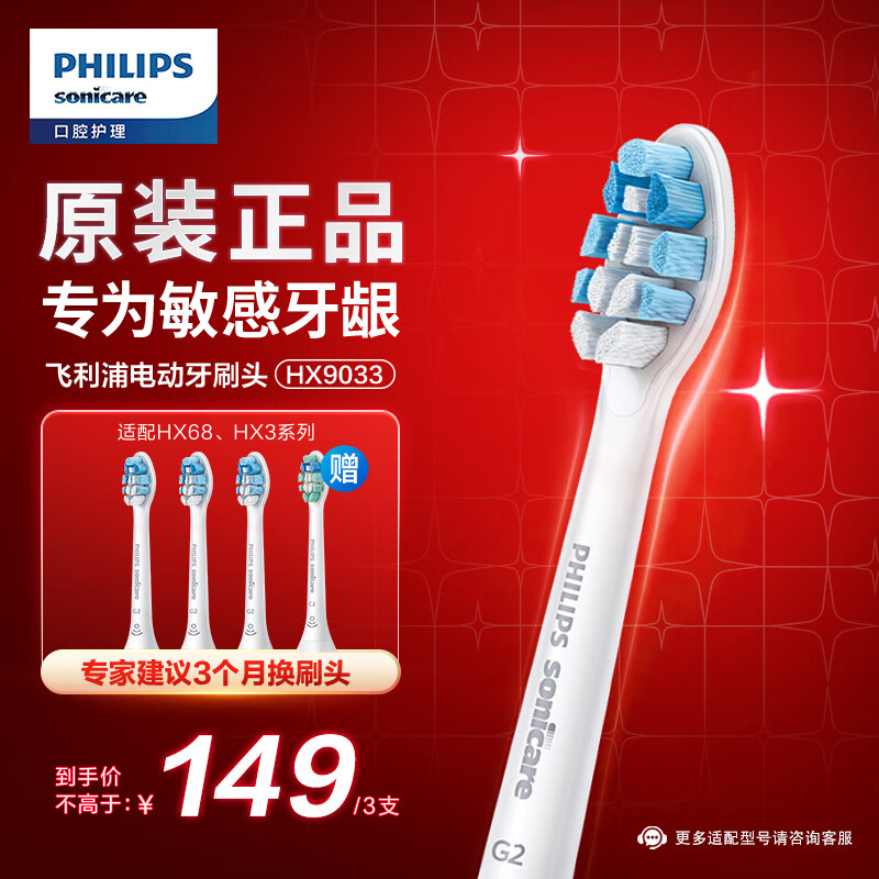 飞利浦(PHILIPS)电动牙刷头 牙龈敏感适用3支装 HX9033 适配HX68、HX3、钻石系列价格:149.00元!