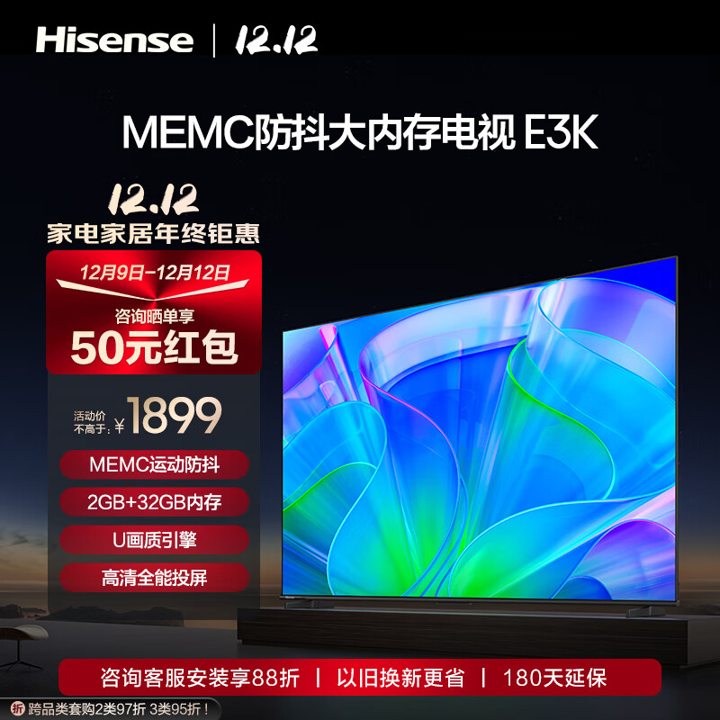 海信电视55E3K 55英寸 MEMC防抖 2GB+32GB U画质引擎 4K高清智慧屏 客厅家用液晶平板电视机 以旧换新价格:1799.00元!