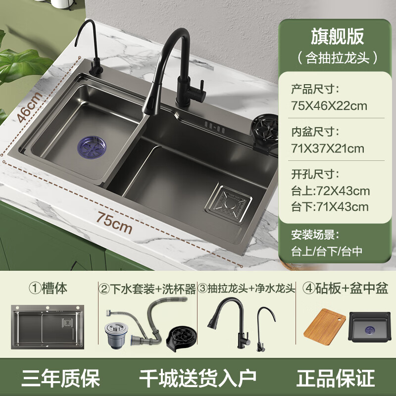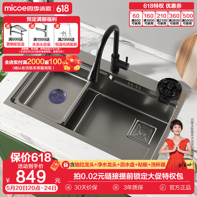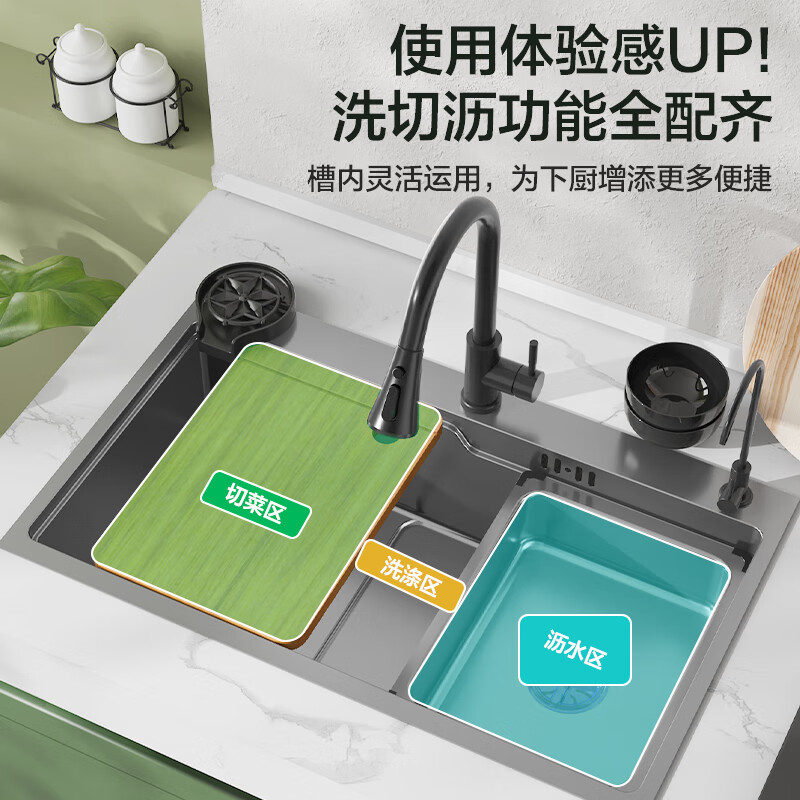 四季沐歌厨房水槽洗菜盆大单槽纳米304不锈钢一体洗碗台下盆多功能阶梯式价格:1049.00元!