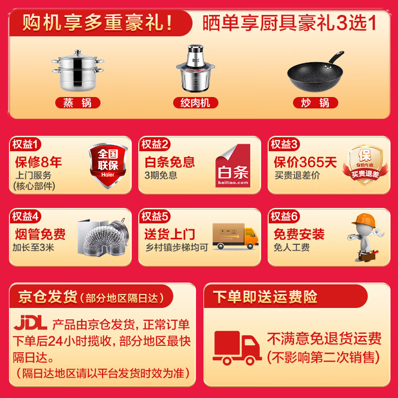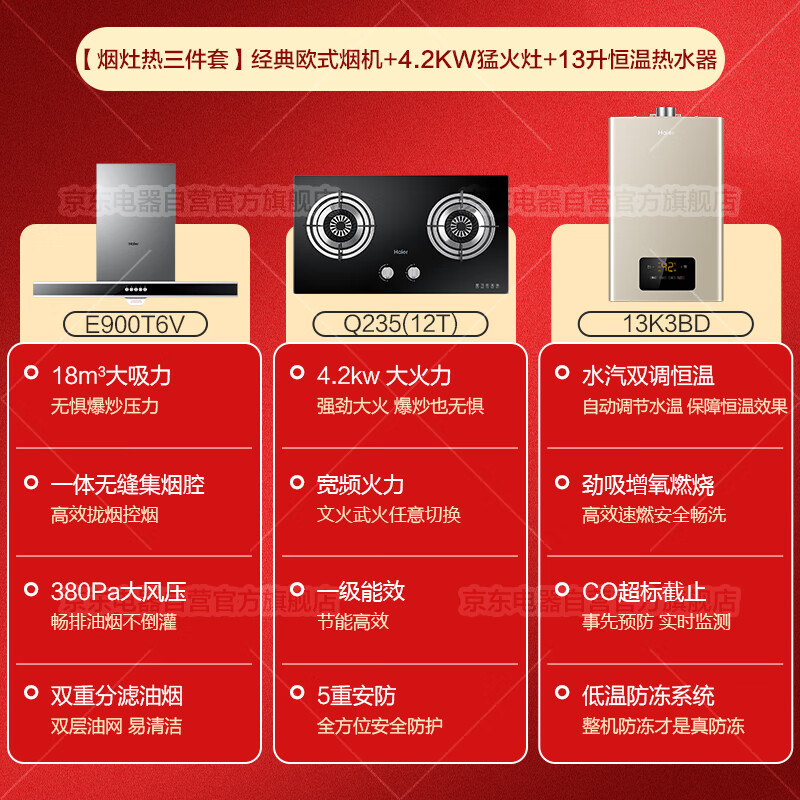 海尔(Haier)抽油烟机燃气灶套装18m3一级能效欧式顶吸E900T6V+4.2KW灶Q235+13升热水器13K3BD厨房三件套[家电]价格:2549.00元!