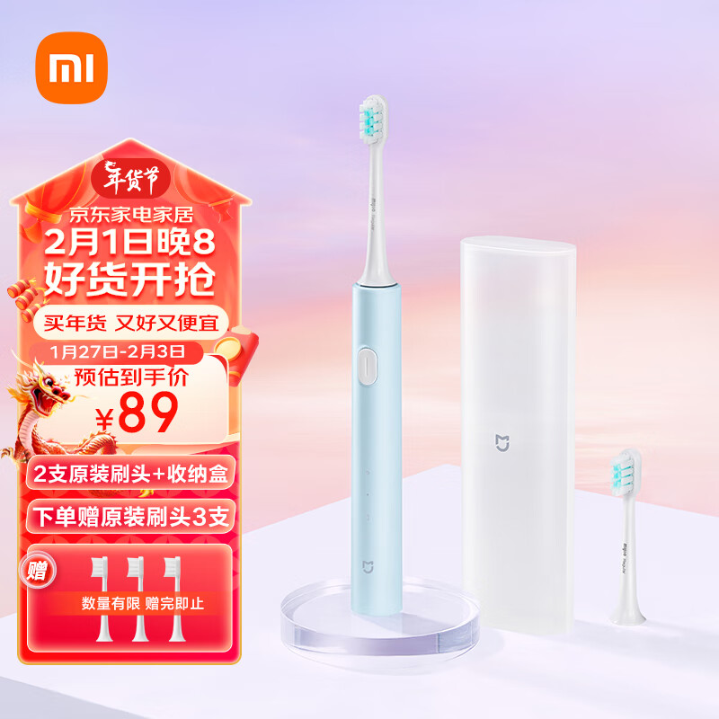 米家小米电动牙刷T200C 成人/学生 双刷头便携护龈套装 情侣款送礼物男/女 蓝色 礼物推荐价格:89.00元!