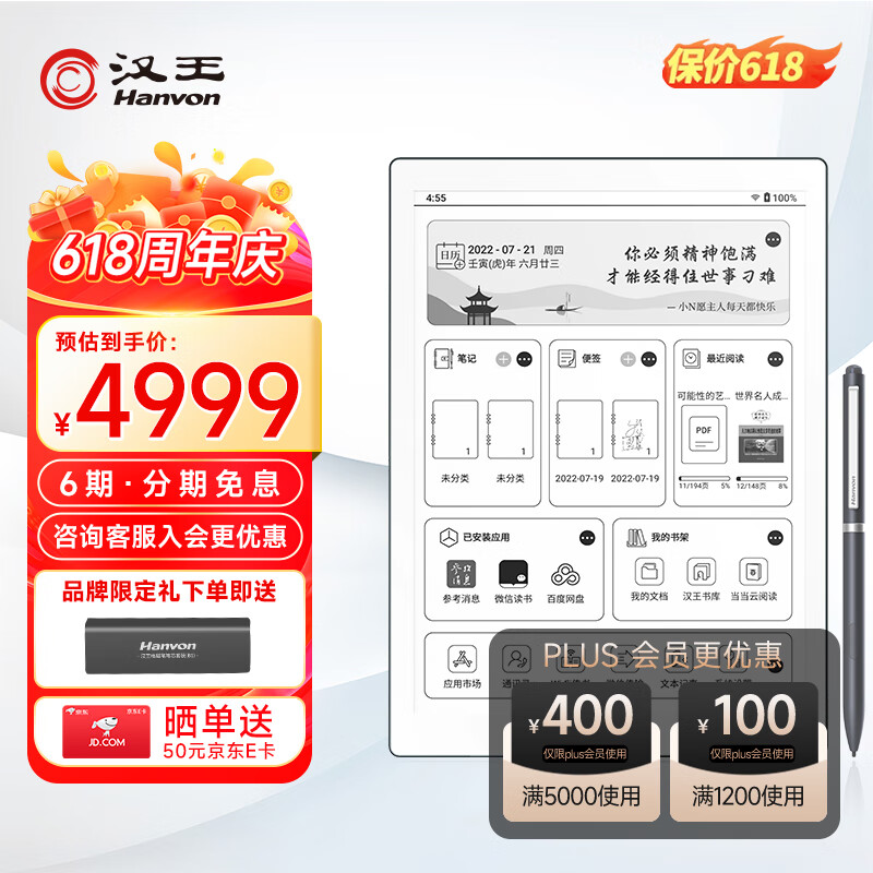 汉王N10Max2024款 电纸书13.3英寸微信读书阅读器专业文献PDF护眼阅览器水墨墨水屏平板办公手写记事本价格:4999.00元!