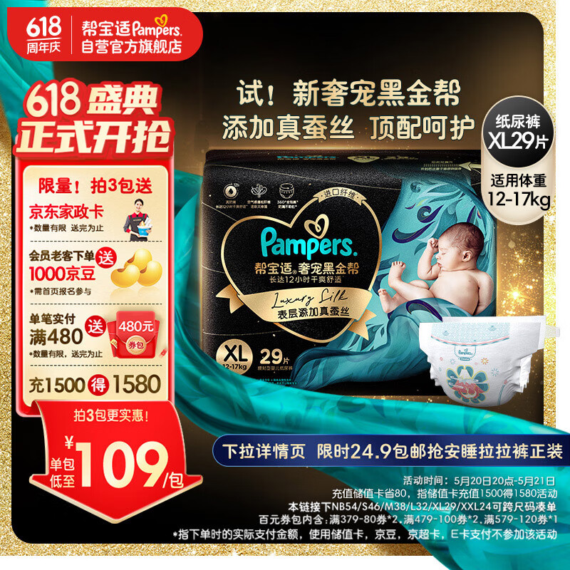 帮宝适黑金帮纸尿裤XL29片(12-17kg)尿不湿尿裤蚕丝 超薄透气价格:123.50元!
