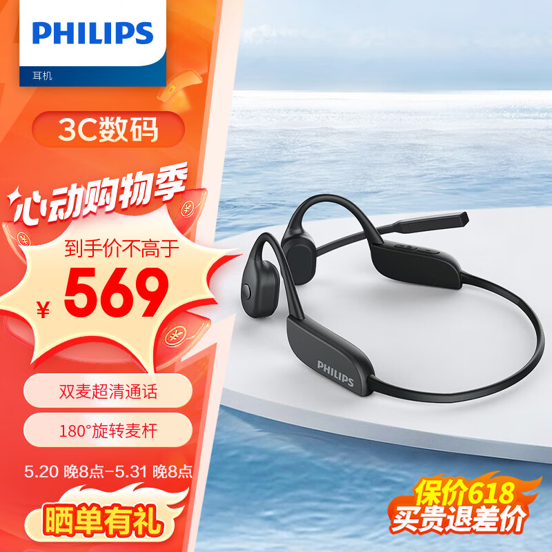 飞利浦(PHILIPS)骨传导蓝牙耳机旋转麦杆双重防水超清通话降噪无线持久续航TAN5609黑价格:569.00元!