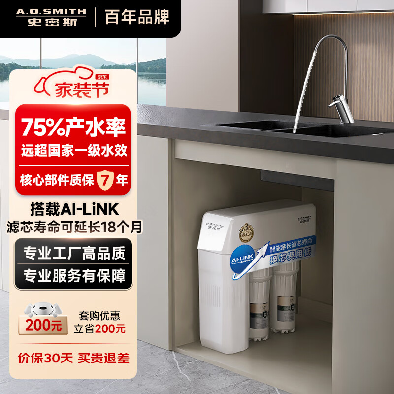 史密斯(A.O.SMITH)净水器家用整机保5年 3:1高水效专利MAX3.0反渗透滤芯厨下式直饮净水机【1600S升级款】R1600HWi-E价格:3398.00元!