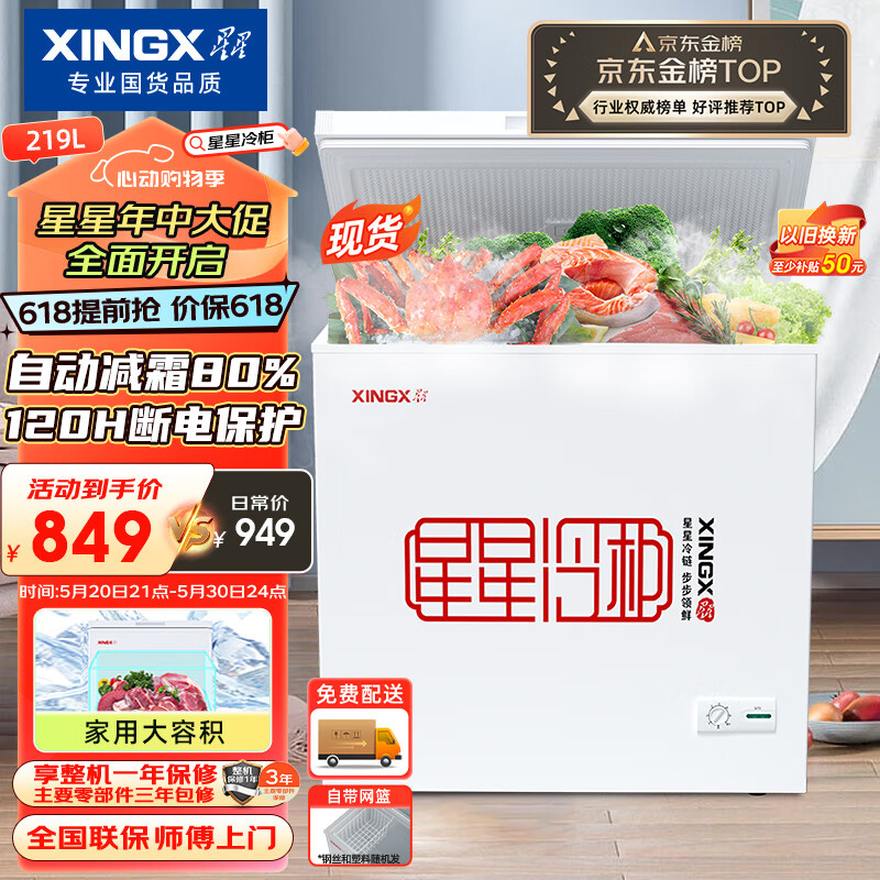 星星(XINGX) 219升小型冰柜家用 冷藏冷冻转换冷柜 商用大容量单温单箱低霜 顶开门冰箱 BD/BC-219E价格:849.00元!
