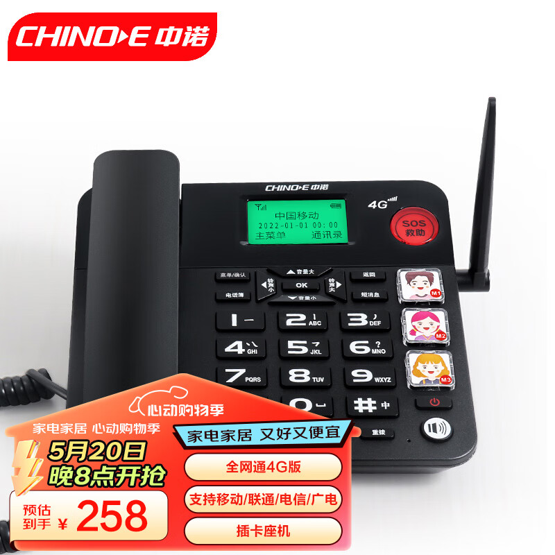 中诺W568通4g5g老人插卡座机电话机SIM无线插卡电话机支持电信移动联通广电四网4G家用办公黑色价格:258.00元!