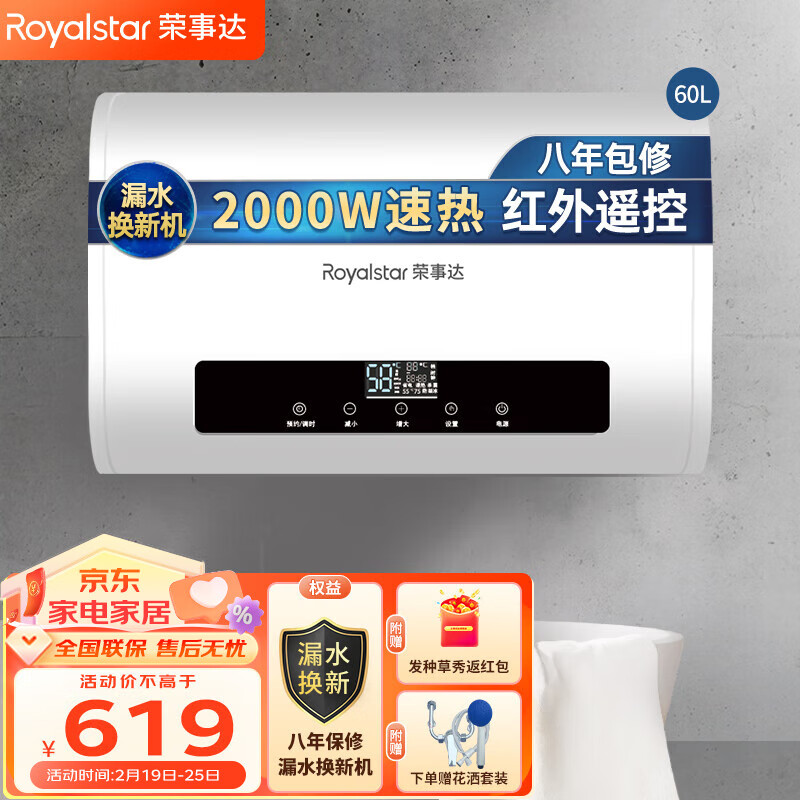 荣事达(Royalstar)电热水器家用 2000w双胆速热卫生间储水式热水器电 纤薄扁桶 一键预约 经济适用 60L 【遥控预约】价格:679.00元!