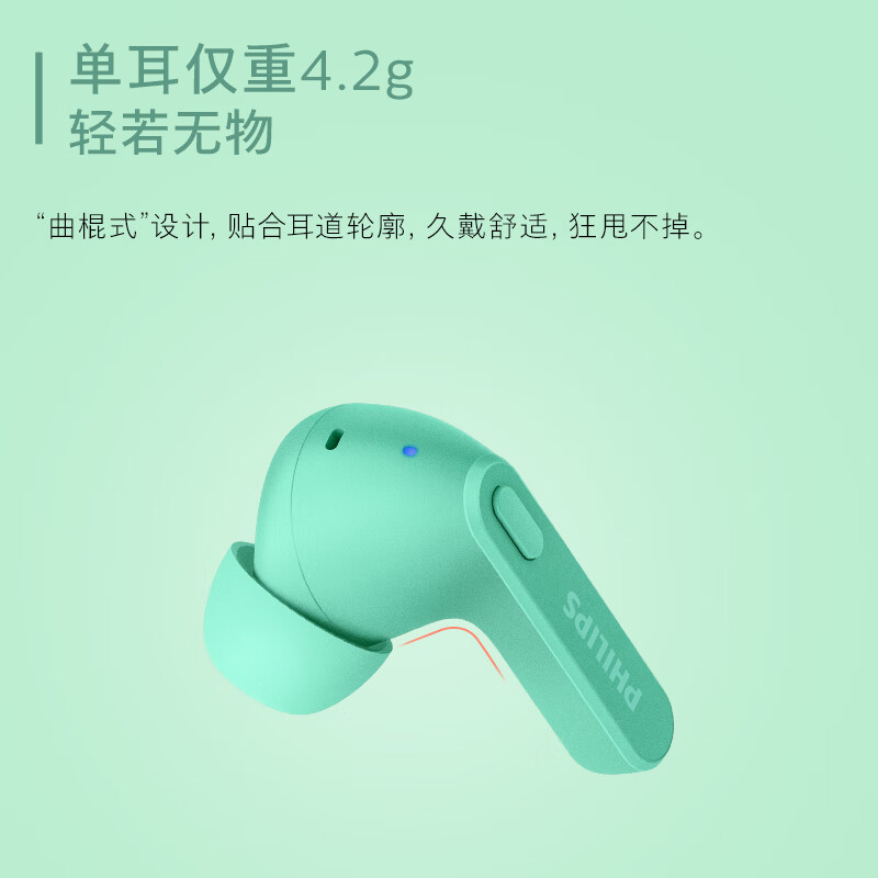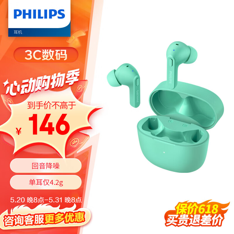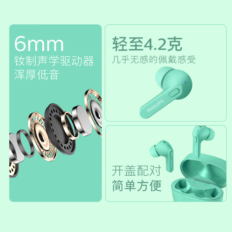 飞利浦(PHILIPS)真无线蓝牙耳机无线运动耳机游戏耳机回音降噪CD级高清音质苹果华为手机TAT2206绿价格:146.00元!