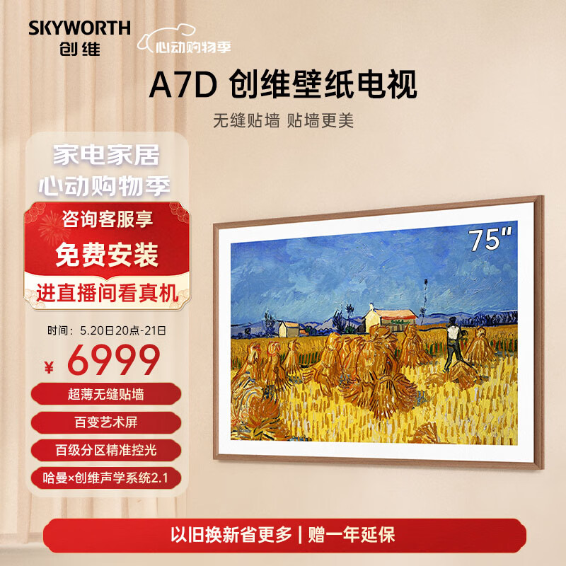 创维壁纸电视75A7D 75英寸超薄壁画艺术电视机 无缝贴墙百变艺术屏 4K超高清护眼液晶电视价格:7399.00元!