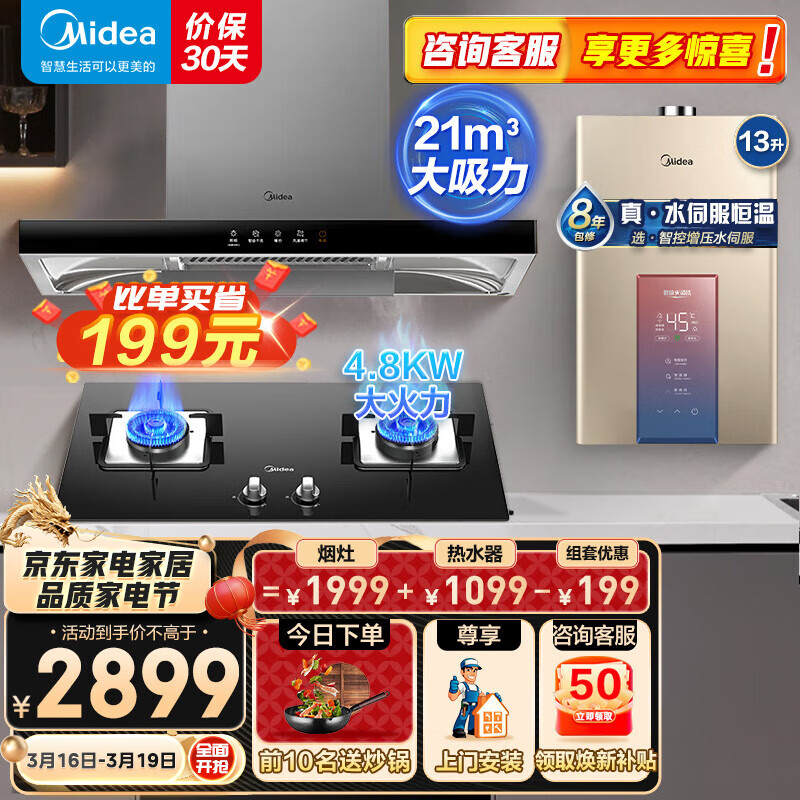 美的(Midea)欧式顶吸抽油烟机灶具烟灶多件套装燃气热水器家用烟灶燃热厨房三件套T201-L+Q217B+13MK3天然气价格:2899.00元!