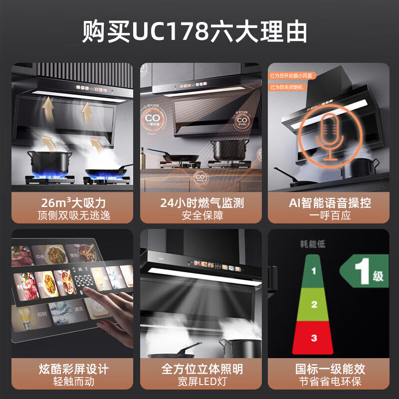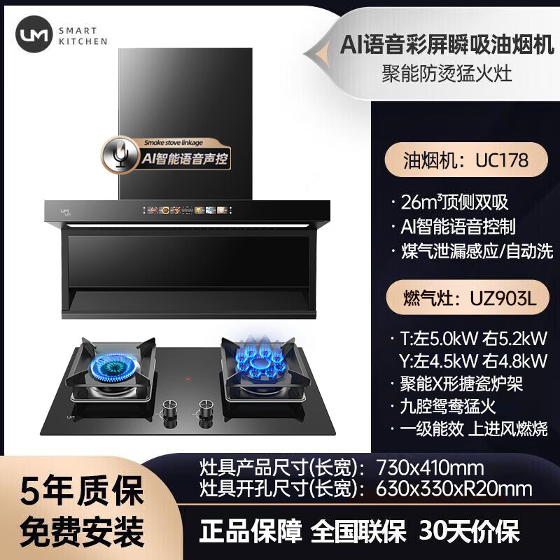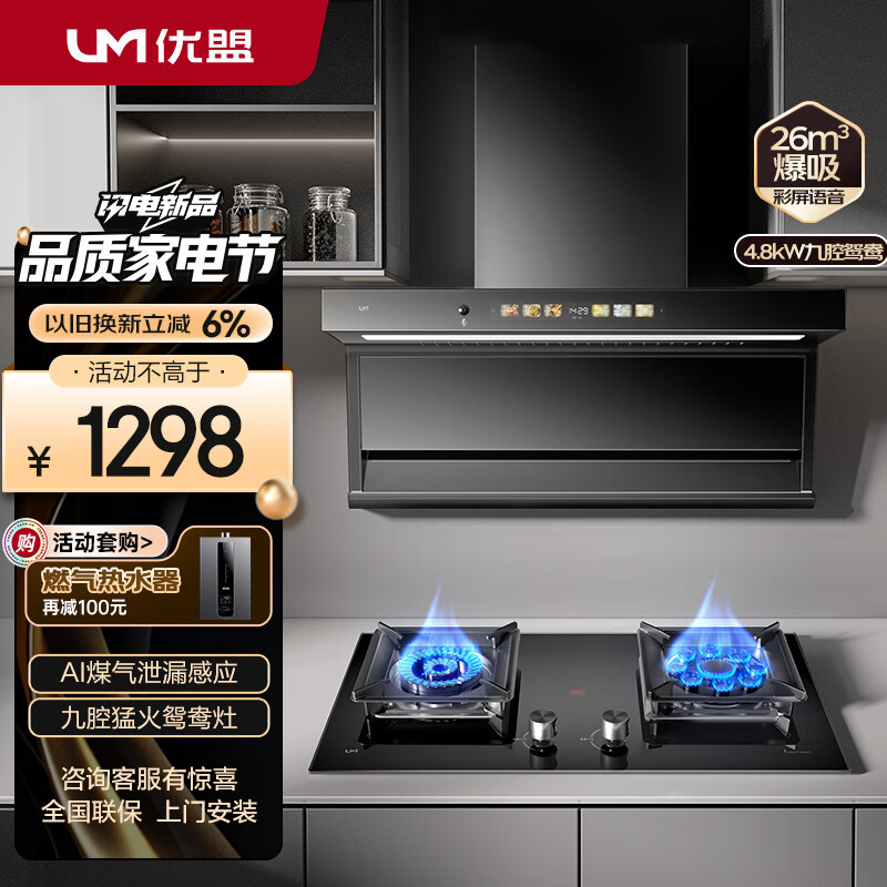 优盟(UM)顶侧双吸抽油烟机 7字型烟灶套装26立方爆炒大吸力挥手感应免拆洗家用油烟机燃气灶具套装 液化气价格:1598.00元!