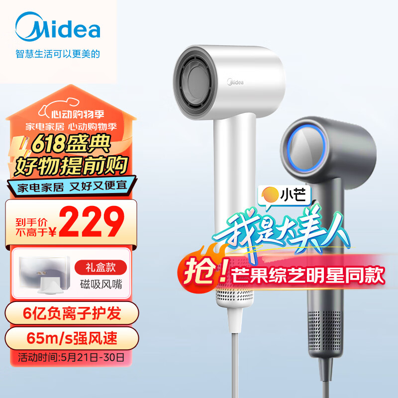 美的(Midea)高速电吹风/家用吹风机/吹风筒/大功率/负离子护发/芒果综艺明星同款电吹风/节日礼物FG2-流光白价格:229.00元!