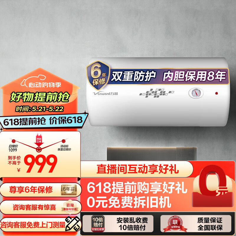 万和(Vanward)100升双防电盾 双重防护 温显型电热水器E100-T4-22价格:999.00元!
