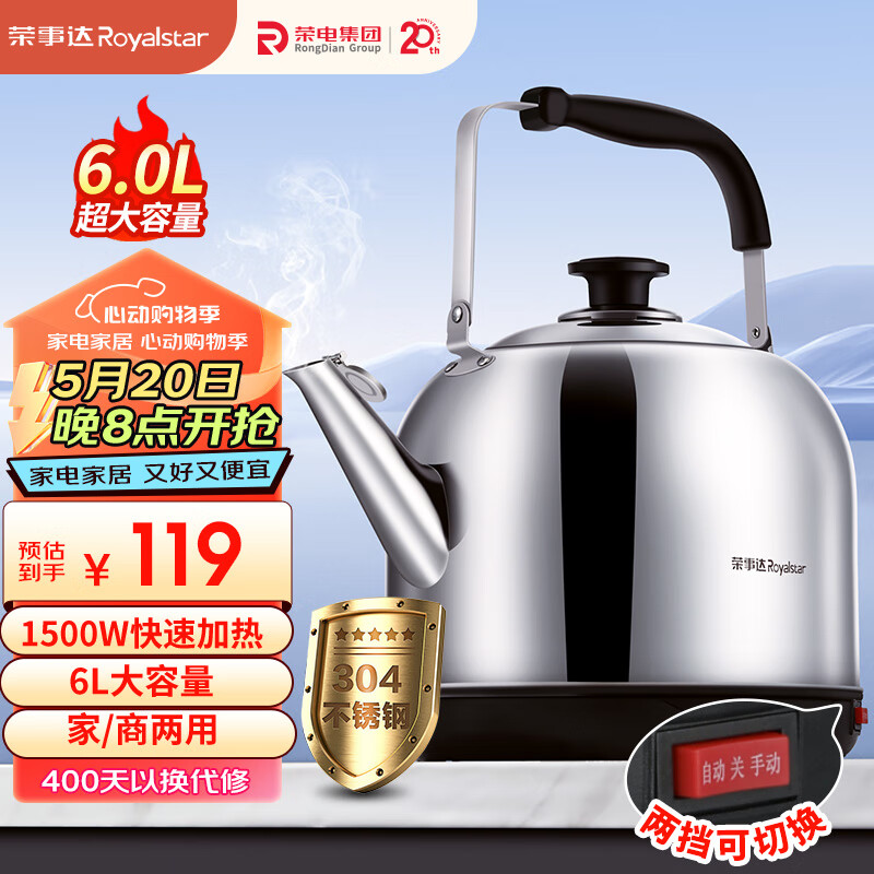 荣事达(Royalstar)电热水壶 烧水壶商用家用热水壶304加厚不锈钢煲水壶自动保温电茶壶6L超大容量开水壶电水壶 JY60Q价格:119.00元!