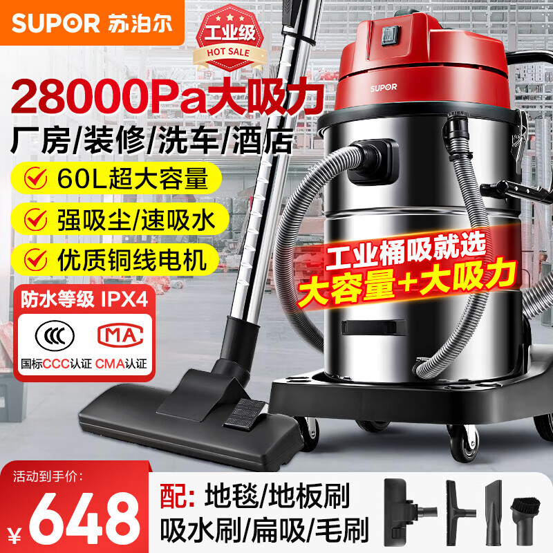 苏泊尔(SUPOR)大功率工业吸尘器工厂车间粉尘大吸力商用大型桶式吸水除尘器装修开荒洗车间保洁EVCB-75S价格:648.00元!