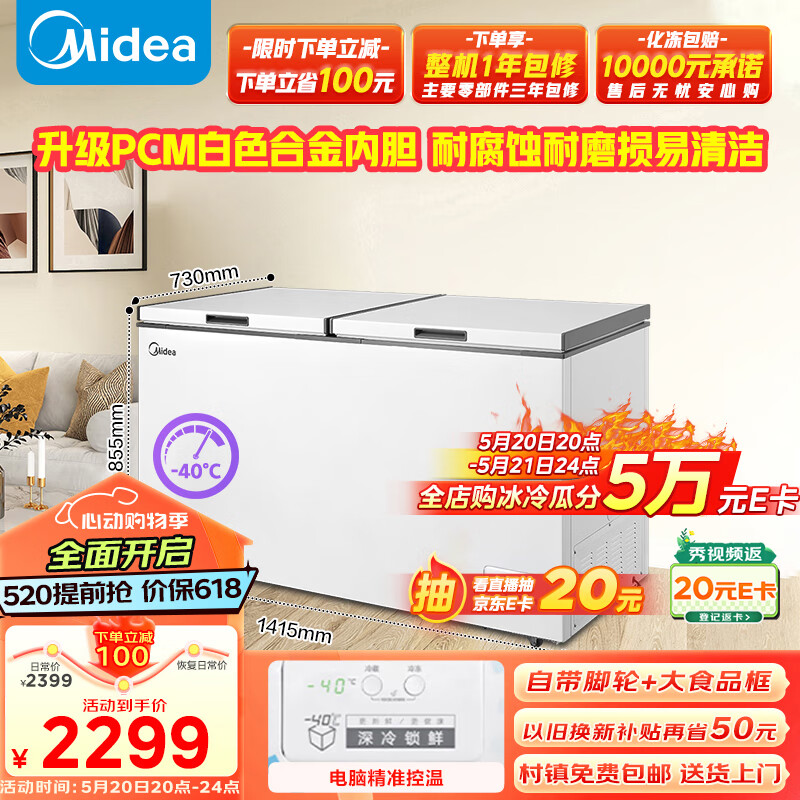 美的(Midea)423升 大容量商用家用冰柜 五面制冷囤货大冷柜 电子控温冷藏冷冻转换卧式冰箱 BD/BC-423DKEM(E)价格:2349.00元!
