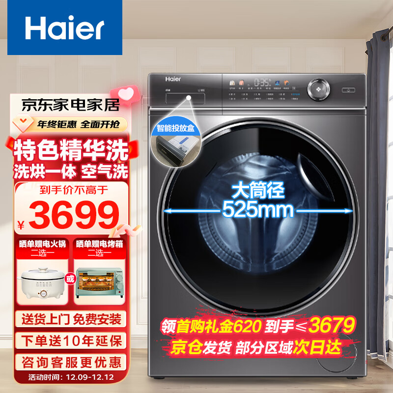 海尔(Haier)【精华洗】10KG全自动滚筒洗衣机家用大容量变频除菌螨智能投放+洗烘一体XQG100-HBD14326L[家电]价格:4299.00元!