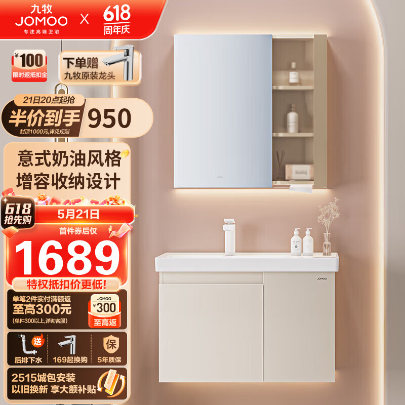 九牧(JOMOO)浴室柜 陶瓷一体盆卫生间悬挂抗菌洗脸盆柜组合80cm A2729-14BI-1价格:2249.00元!