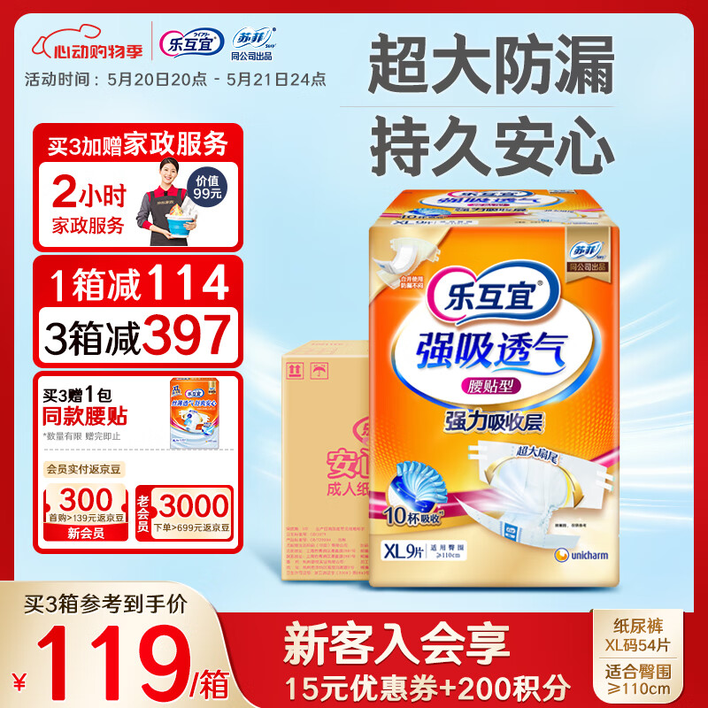 乐互宜丝薄透气成人纸尿裤老年人孕妇专用腰贴型XL码箱装54片价格:308.00元!