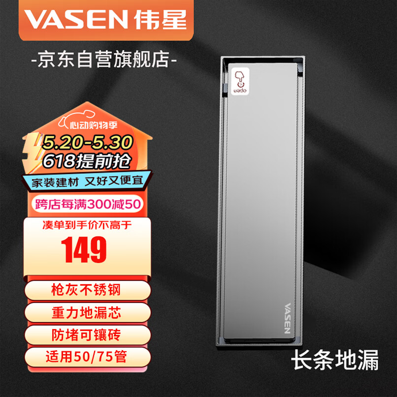 伟星可镶砖地漏3513长条枪灰不锈钢隐形50 75管防虫阳台卫生间价格:149.00元!