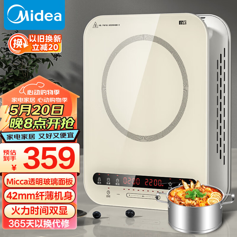 美的(Midea)电磁炉 家用2200W大功率 恒匀火加热 电磁灶火锅炉爆炒定时电磁炉套装 C22-Micca705 配欧式汤锅价格:359.00元!