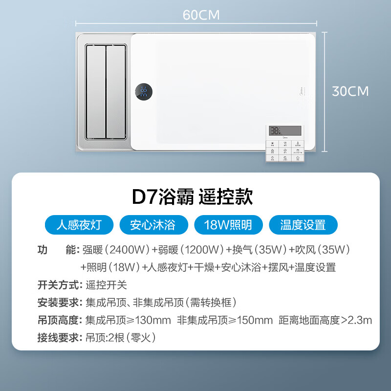 4、美的安装也方便,专门有师傅来装,很靠谱的。也可自己安装,风暖对眼睛好,灯光亮堂又不刺眼,比灯暖的好,也不用总是要更换灯泡,方便很多。有需要还会再买美的的其他产品。十合一功能多,尤其是干燥功能很实用,灯光也很亮堂。