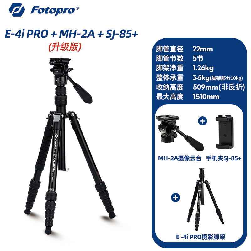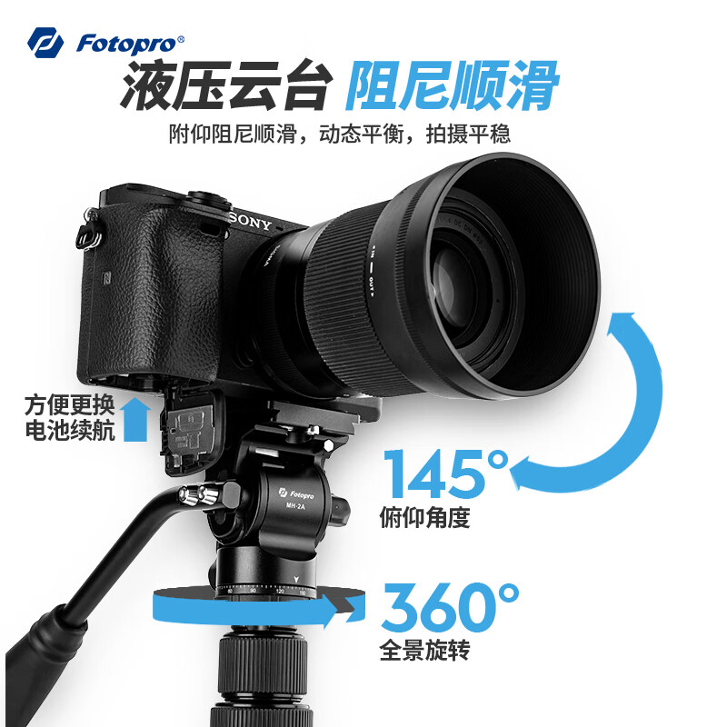 富图宝(Fotopro)E4I PRO+MH-2A 便携反折可变独脚相机摄影液压视频云台三脚架 原碳灰价格:369.00元!