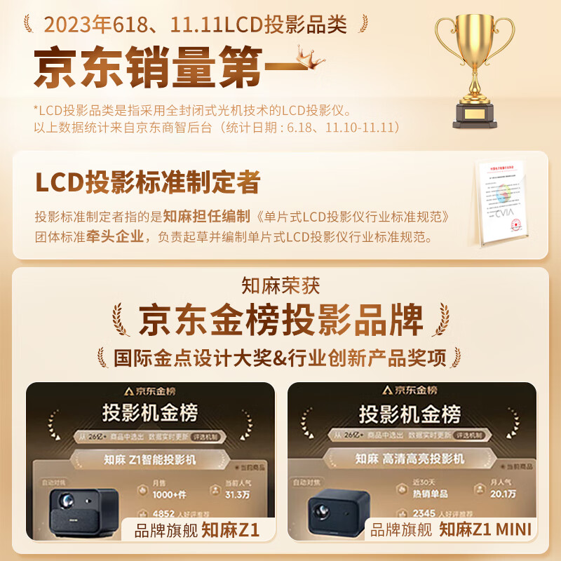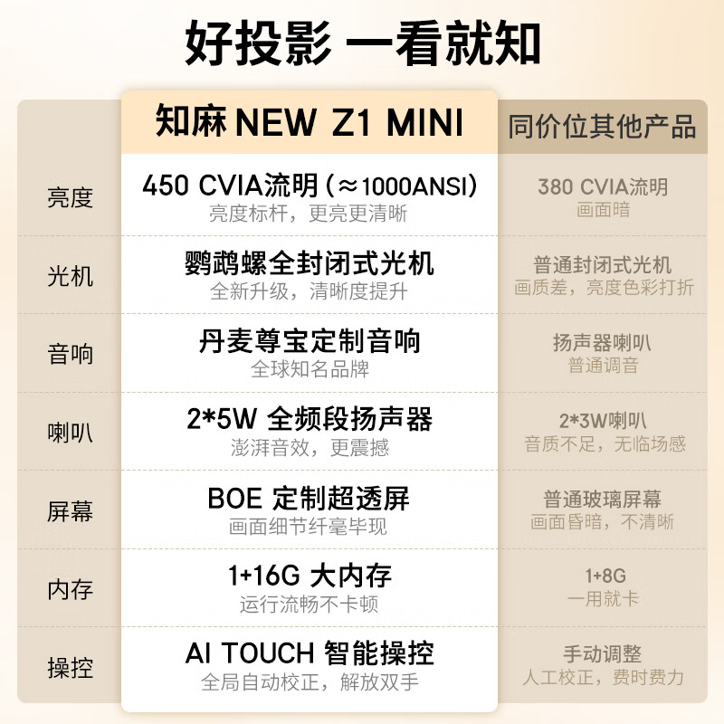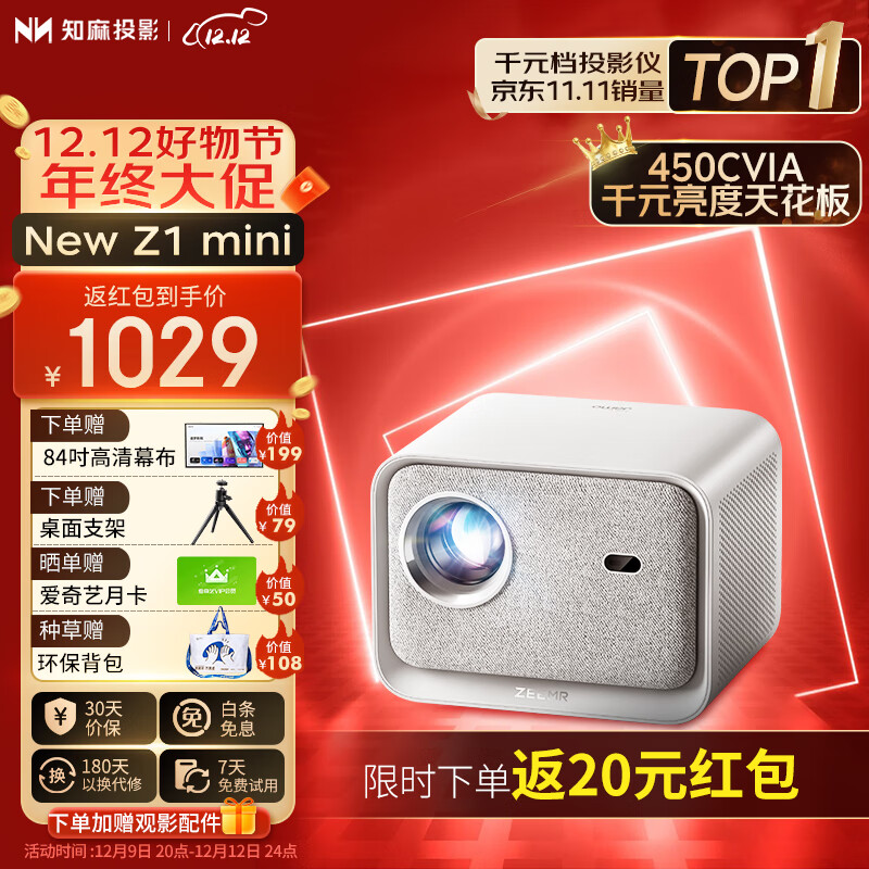 知麻New Z1 mini 2023款 投影仪家用 投影机卧室客厅 智能家庭影院芝麻(450 CVIA流明 全自动校正 全域清晰)价格:1049.00元!