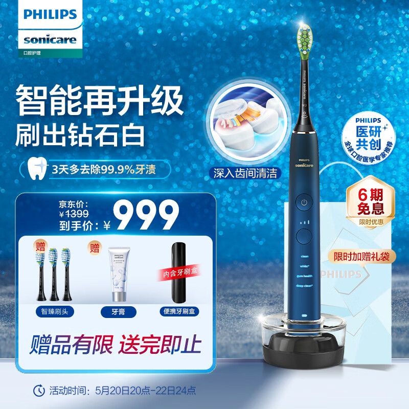 飞利浦(PHILIPS)电动牙刷成人 520情侣送男/女友 母亲节礼物 声波震动 1支刷头 HX9911钻石9系 水手蓝价格:1199.00元!
