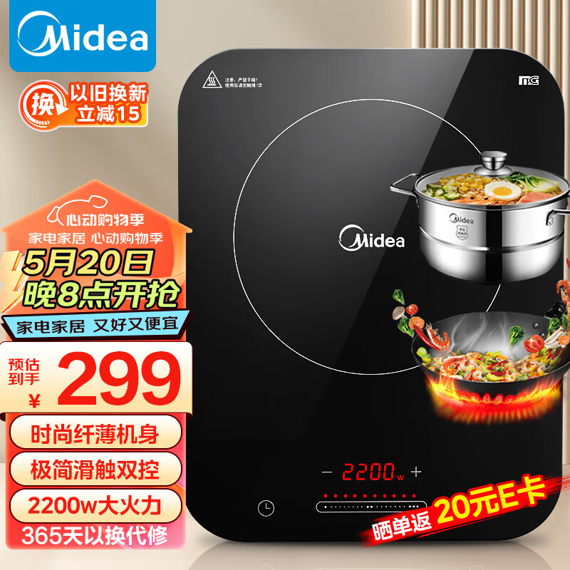 美的(Midea)电磁炉 家用大功率 2200W 恒匀火技术 智能断电 微晶面板 C22-WH2237(配汤蒸锅+渗氮炒锅)价格:299.00元!
