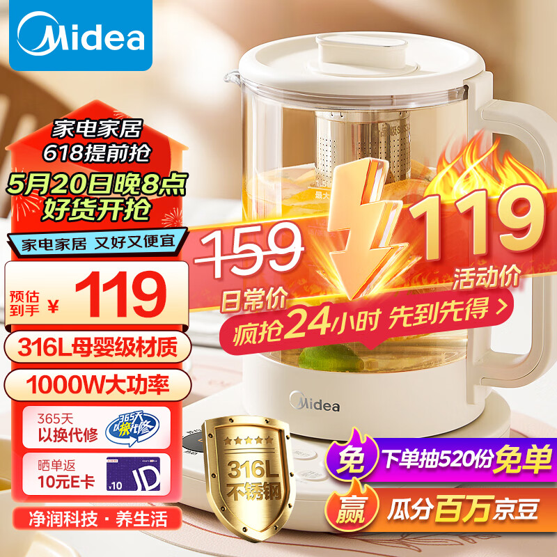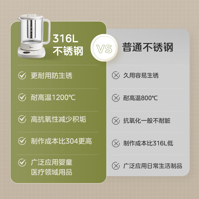 美的(Midea)养生壶 316L不锈钢1.5L煮茶壶 1000W功率 24小时预约烧水壶 12小时恒温多段控温电热水壶YS15TM-Y1价格:119.00元!
