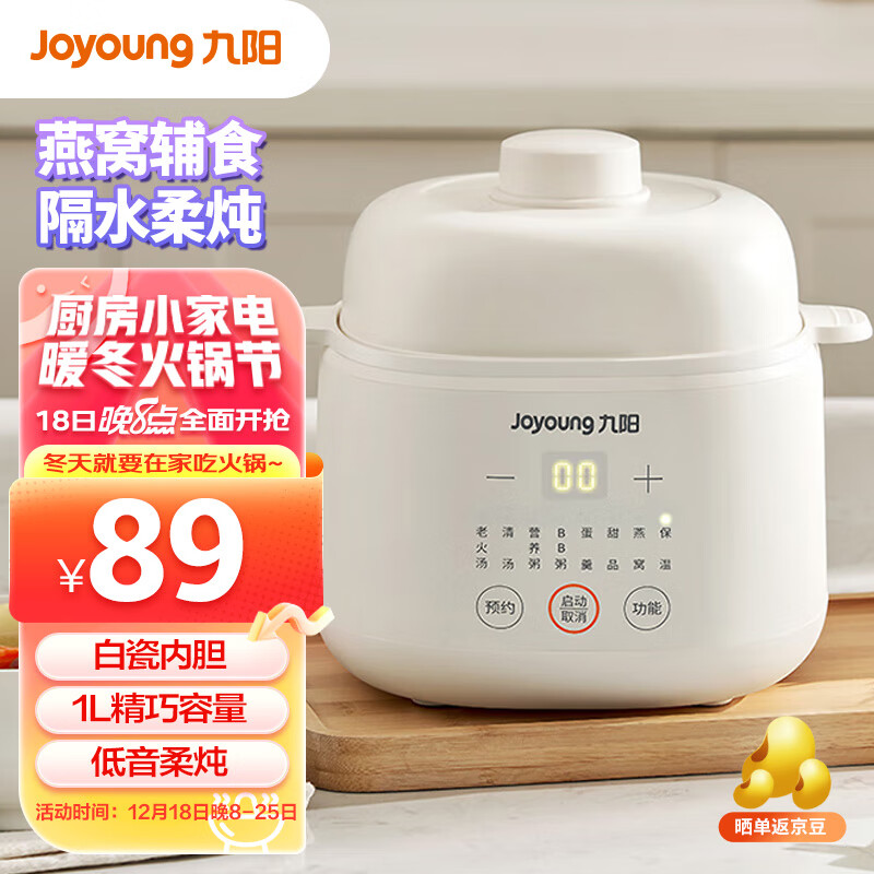 九阳(Joyoung)1L精巧容量电炖锅燕窝炖盅隔水炖锅宝宝辅食婴儿bb煲迷你煮粥煲汤锅小容量白瓷DG10G-GD103价格:89.00元!