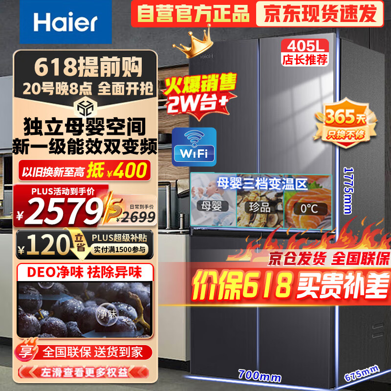 海尔(Haier)405升十字对开门冰箱四开门多门一级能效风冷无霜电母婴超薄智能双变频BCD-405WLHTDEDS9U1价格:2579.00元!