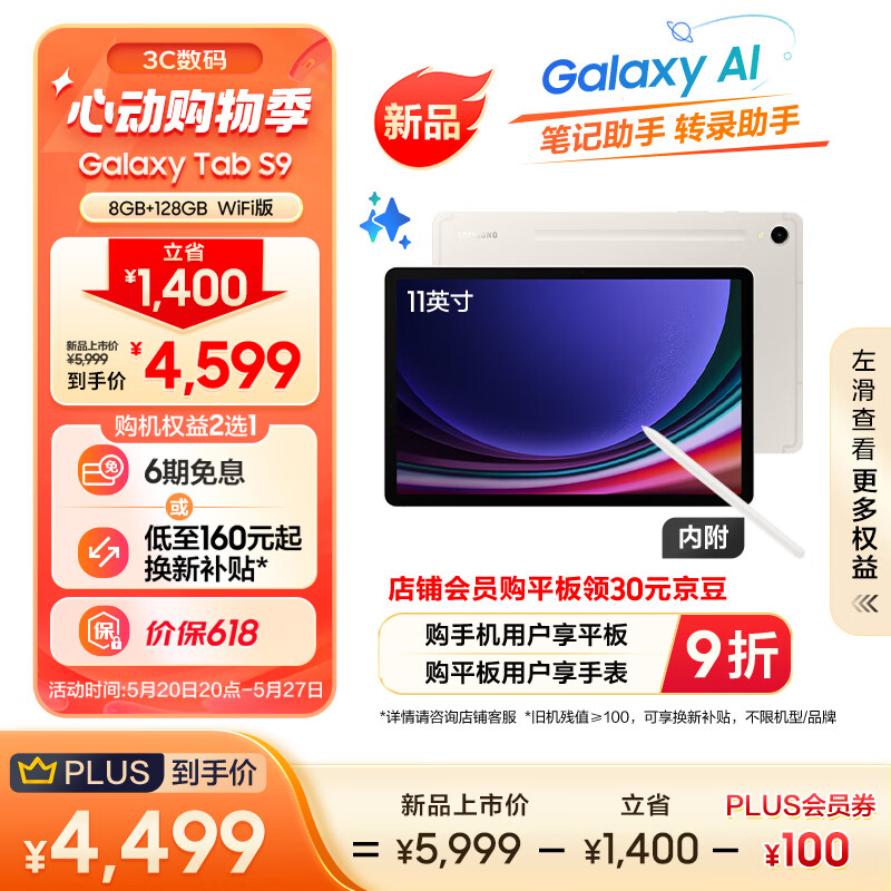 三星(SAMSUNG)S9 Al智享学习办公平板电脑11英寸骁龙8Gen2 120Hz 8G+128GB WIFI版含Spen AI平板云雾金价格:4599.00元!