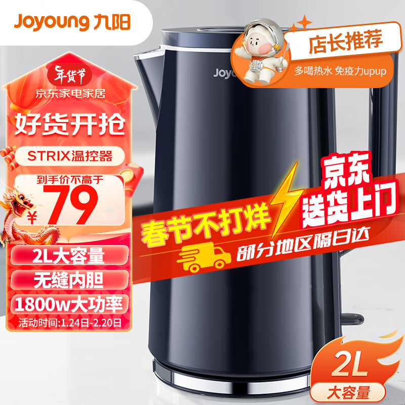 九阳(Joyoung)热水壶烧水壶电水壶 2L速热 一体无缝内胆 快速沸腾 超大容量 家用开水壶 K20FD-W182价格:79.00元!