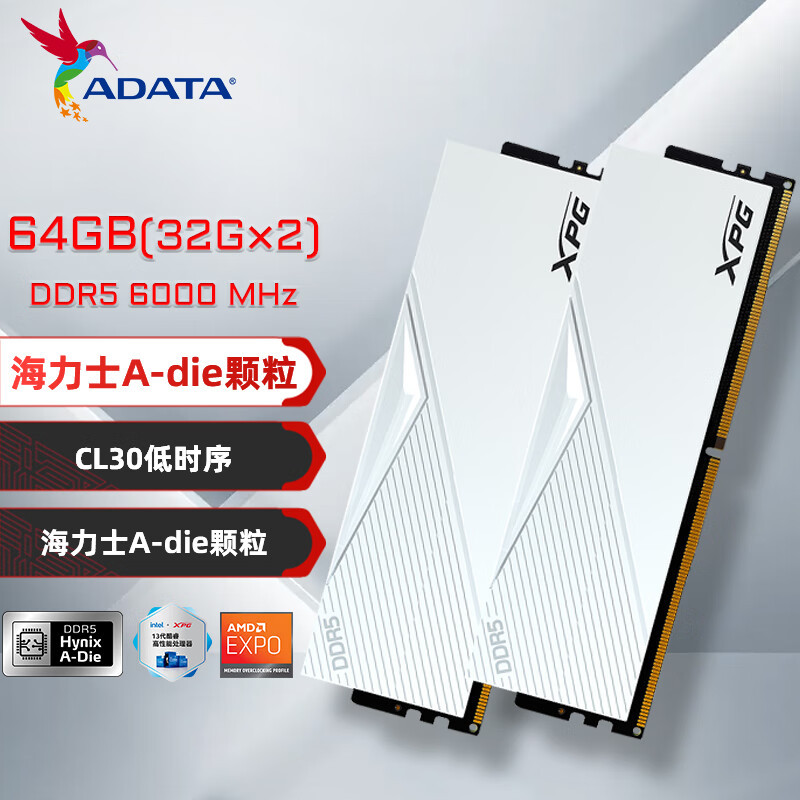 威刚(ADATA)64GB(32GX2)套装 DDR5 6000 台式机内存条 海力士A-die颗粒-LANCER (釉白)C30 D500价格:1679.00元!