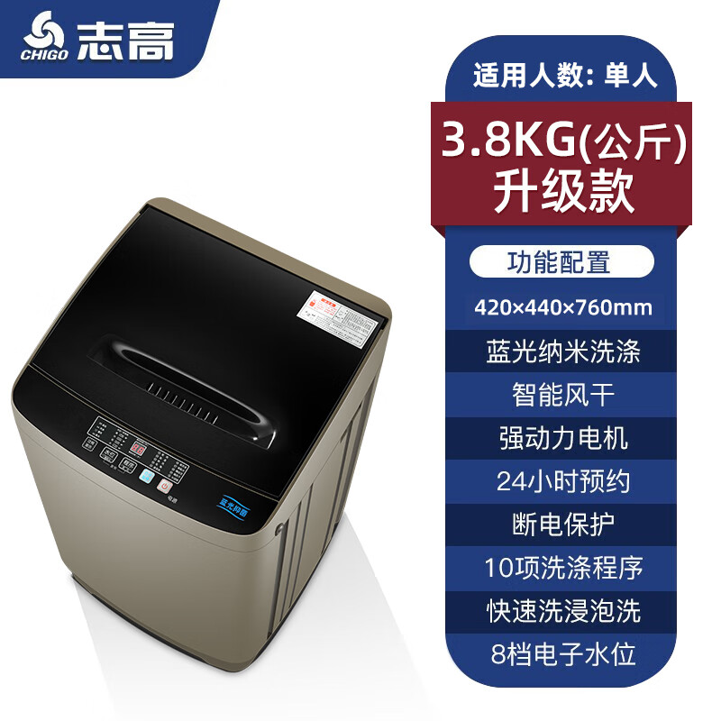 志高(CHIGO)3.8公斤家用全自动洗衣机母婴智能波轮洗脱一体机带风干功能XQB38-2010咖啡金价格:428.00元!