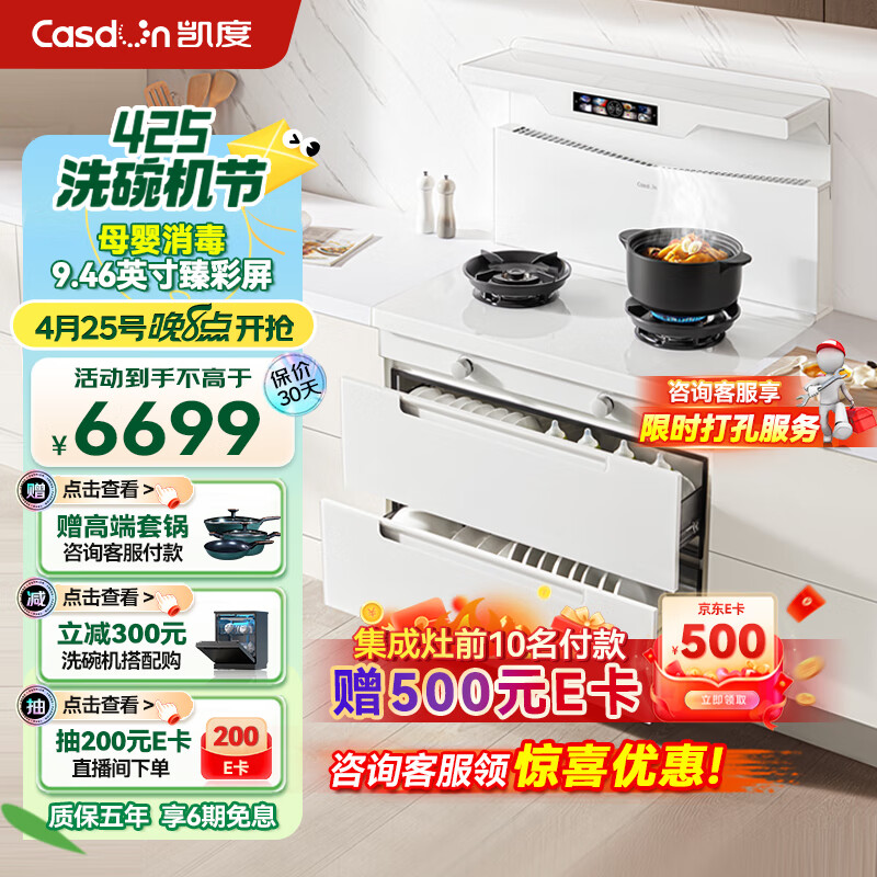 凯度(CASDON)集成灶消毒集成灶一体式集成燃气灶侧吸式抽油烟机一体机 变频5.2kw火力120L双抽 X02白色天然气价格:7699.00元!