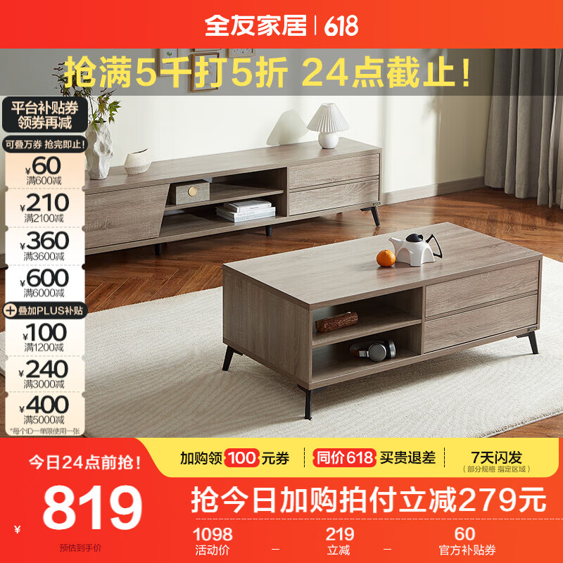 全友家居 现代简约茶几电视柜 木纹多区储物收纳客厅家具670103A价格:1098.75元!