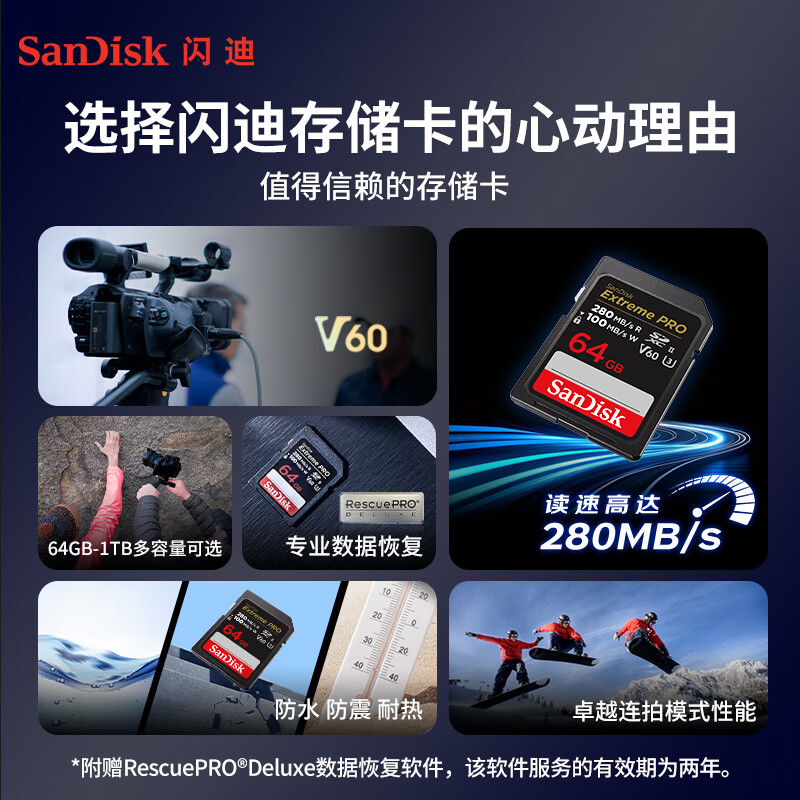 闪迪(SanDisk)64GB V60 SD存储卡U3 C10 6K高速相机内存卡 读速280MB/s 写速100MB/s 高清拍摄 畅快连拍价格:369.00元!