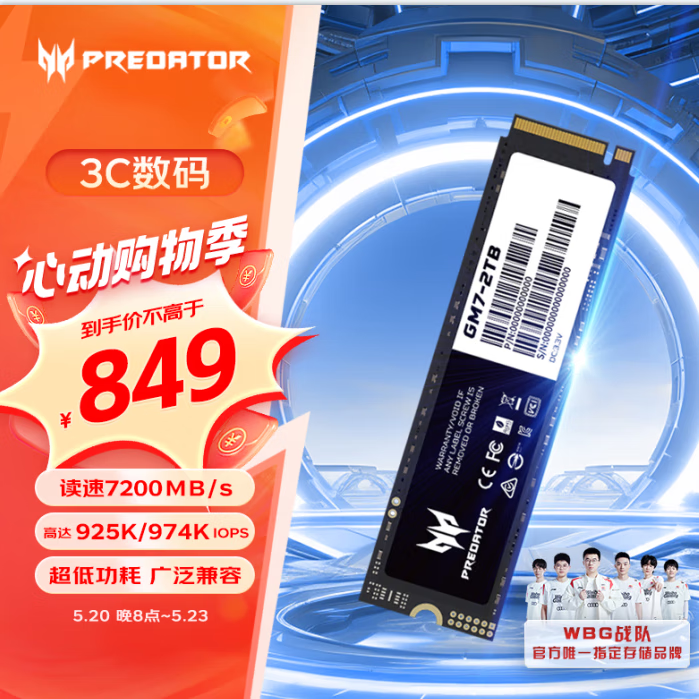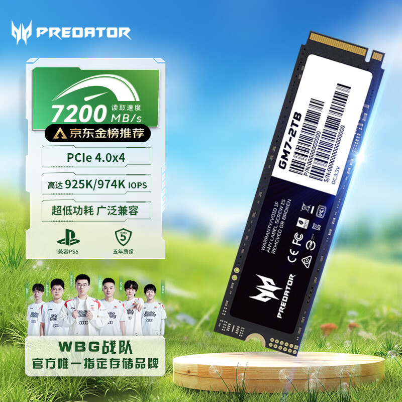 宏碁掠夺者(PREDATOR)2TB SSD固态硬盘 M.2接口(NVMe协议) GM7系列|NVMe PCIe 4.0读速7200MB/s AI电脑存储配件价格:849.00元!